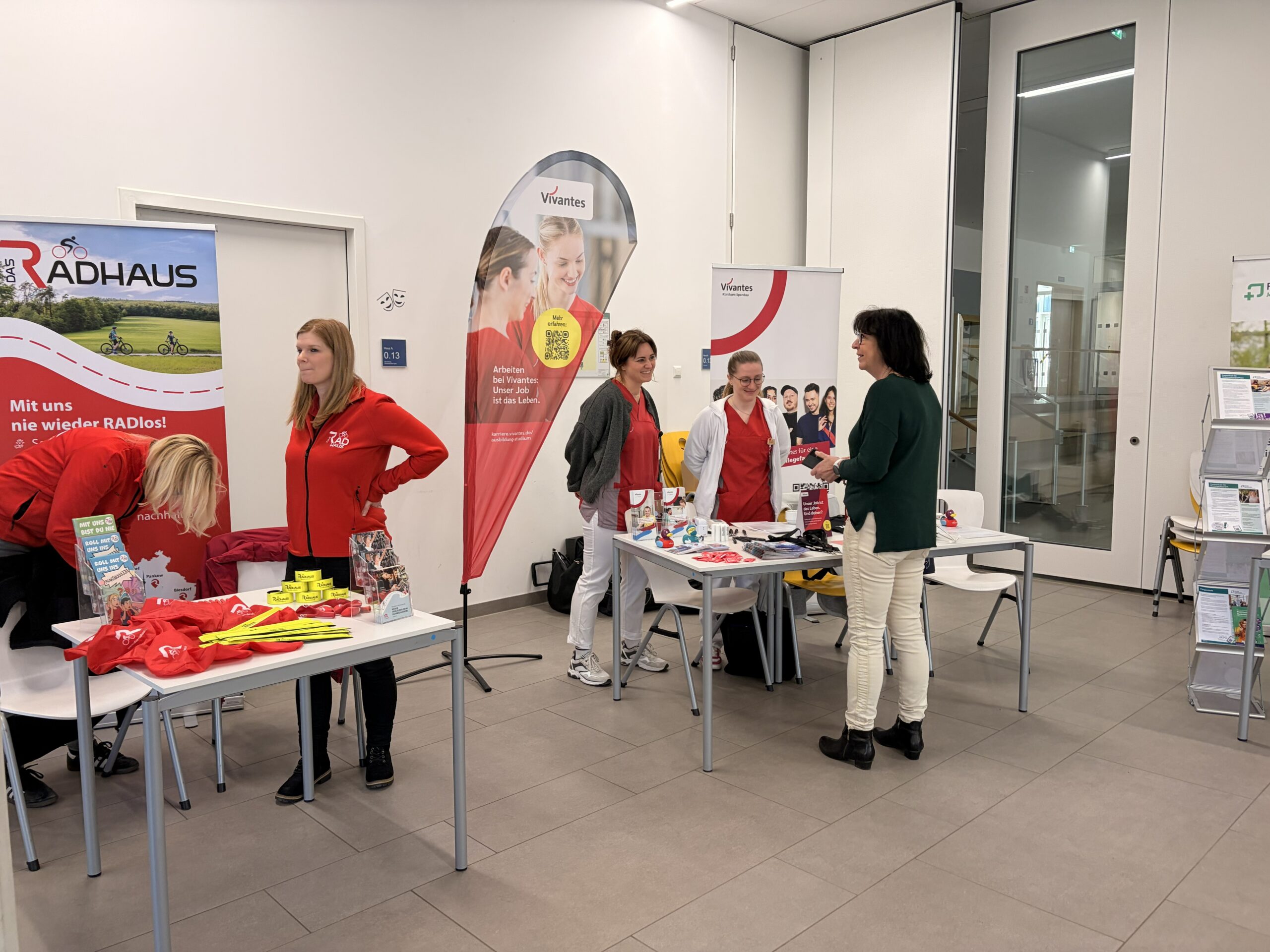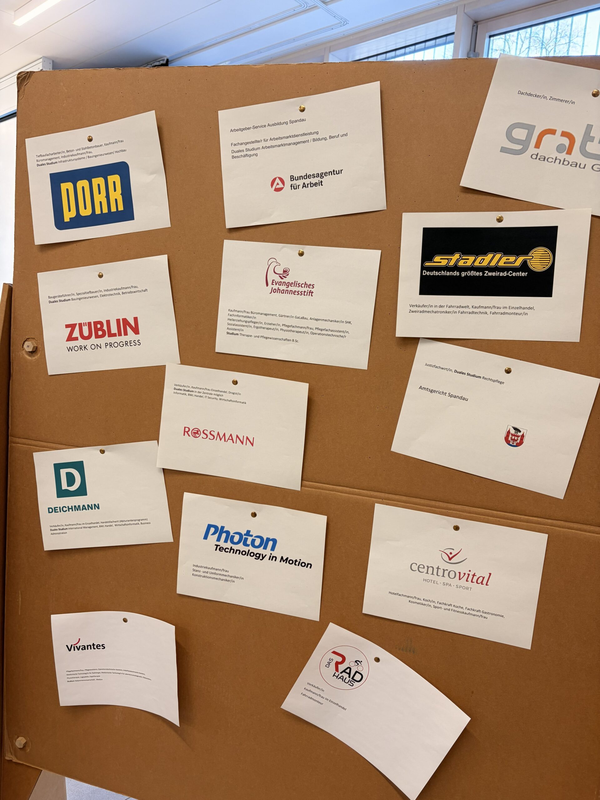 Insgesamt 13 Betriebe aus der Region (Deichmann, die Agentur für Arbeit, Zweirad-Center Stadler, Centrovital Hotel, Amtsgericht Spandau, Rad-Haus, Photon Laser Manufactering, Vivantes, Porr, Gratec Dachbau, Züblin, Rossmann, Knobelsdorff-Schule OSZ Bautechnik I) haben sich in unserer Aula den Schüler*innen mit ihrem Ausbildungs- und Studienangebot vorgestellt.