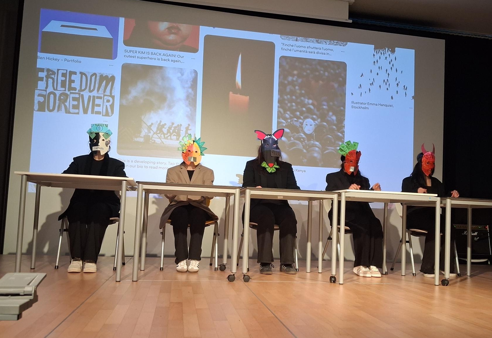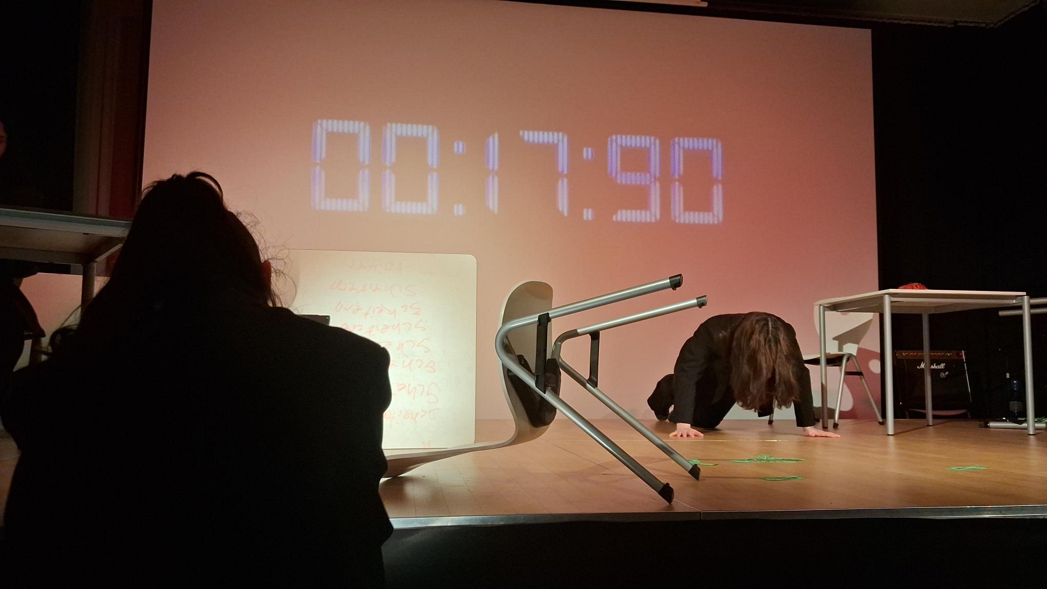 Vor der Pause präsentierte der Oberstufenkurs Darstellendes Spiel von Frau Modde in einer eindrucksvollen Inszenierung ihre Arbeit der letzten Monate. Auf vielfältige Art und Weise setzen die Schüler*innen auf der Bühne „Scheitern“, „Demokratie“ und die Frage nach einem perfekten Staat in Szene.