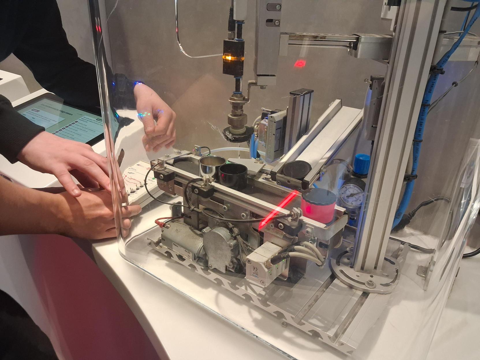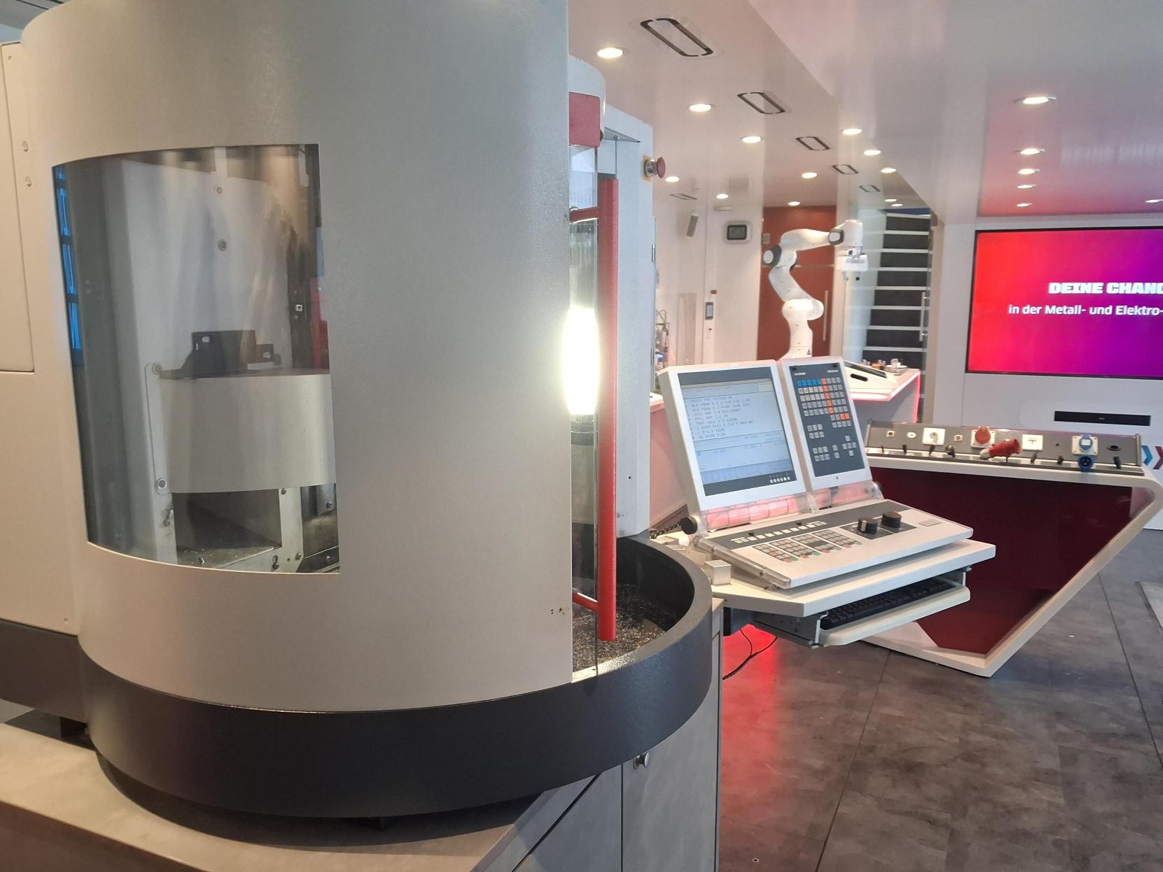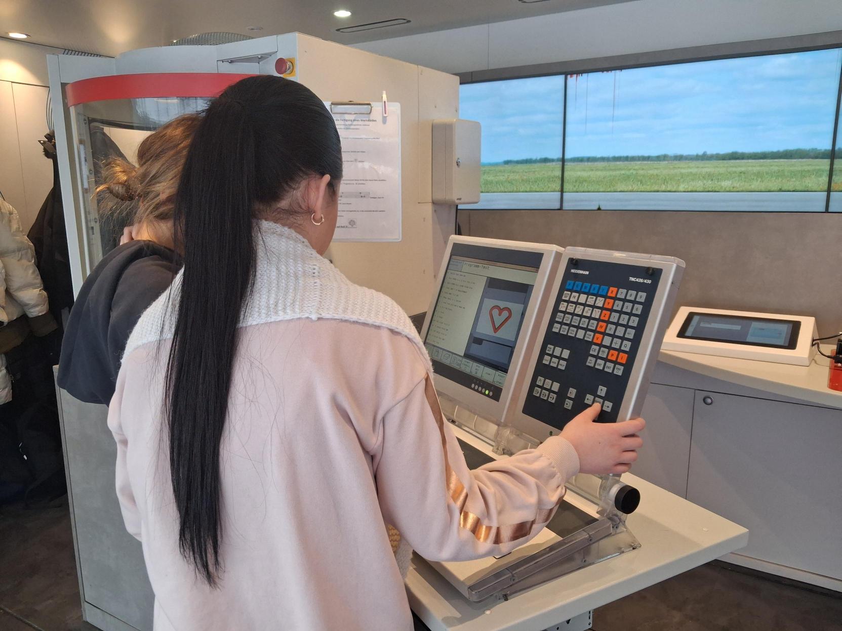 In der unteren Etage des Trucks konnten sich alle praktisch ausprobieren. Schaltkreise legen und zum Laufen bzw. Leuchten bringen, Roboterarme, die Zahnräder koordinieren, verschiedene Steckersysteme und die Pneumatik gewährten Einblicke in verschiedene Bereiche der Branche. Besonders spannend war die CNC-Fräsmaschine, mit der kleine Bilder in Metallplättchen oder Würfel gefräst werden konnten, die anschließend als kleine Andenken mitgenommen werden durften. Beeindruckend waren hier die Präzision und Vielfalt an gestalterischen Möglichkeiten.