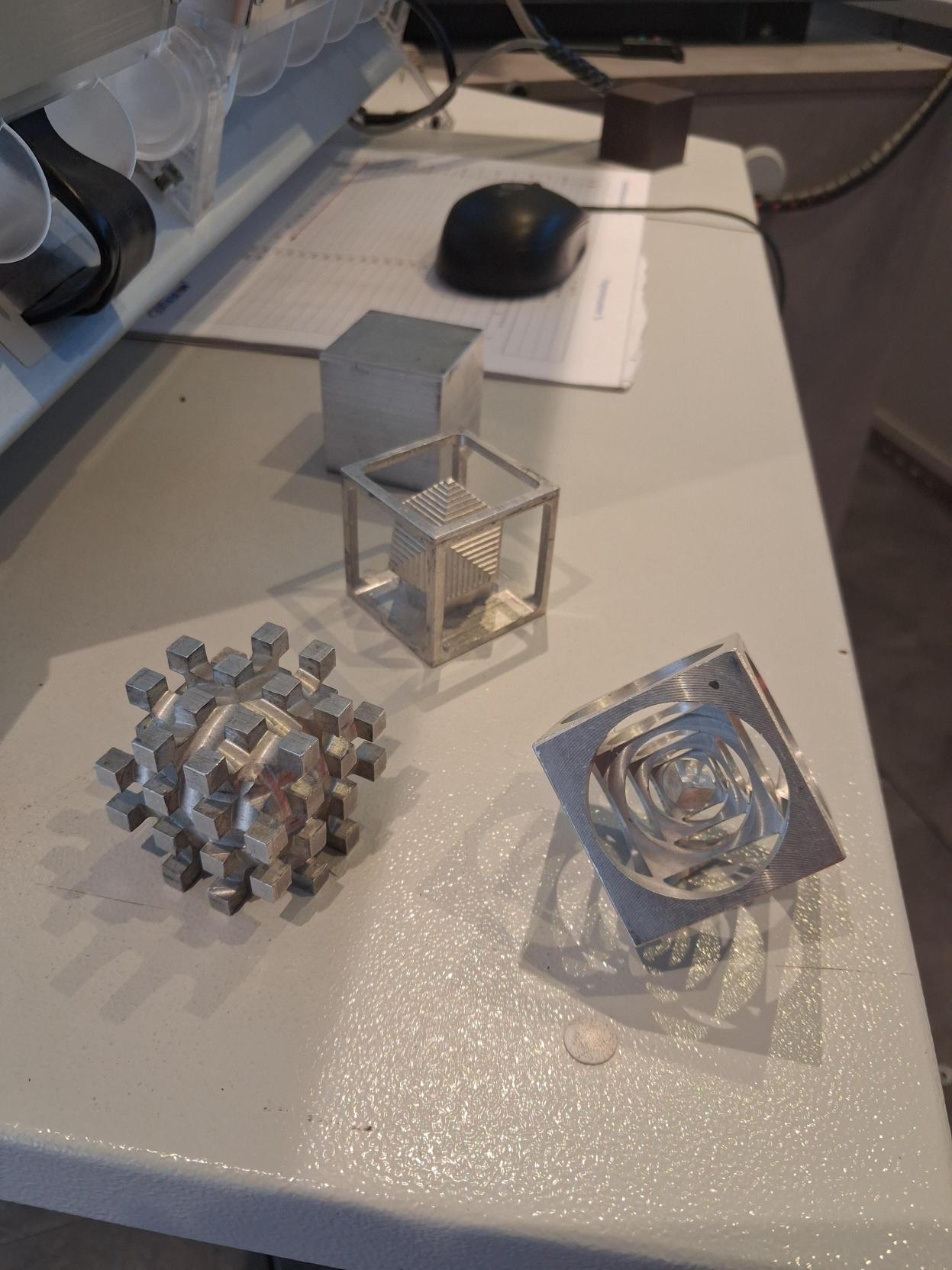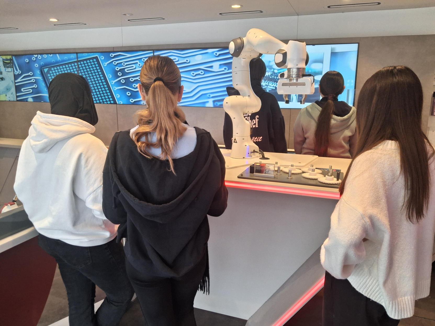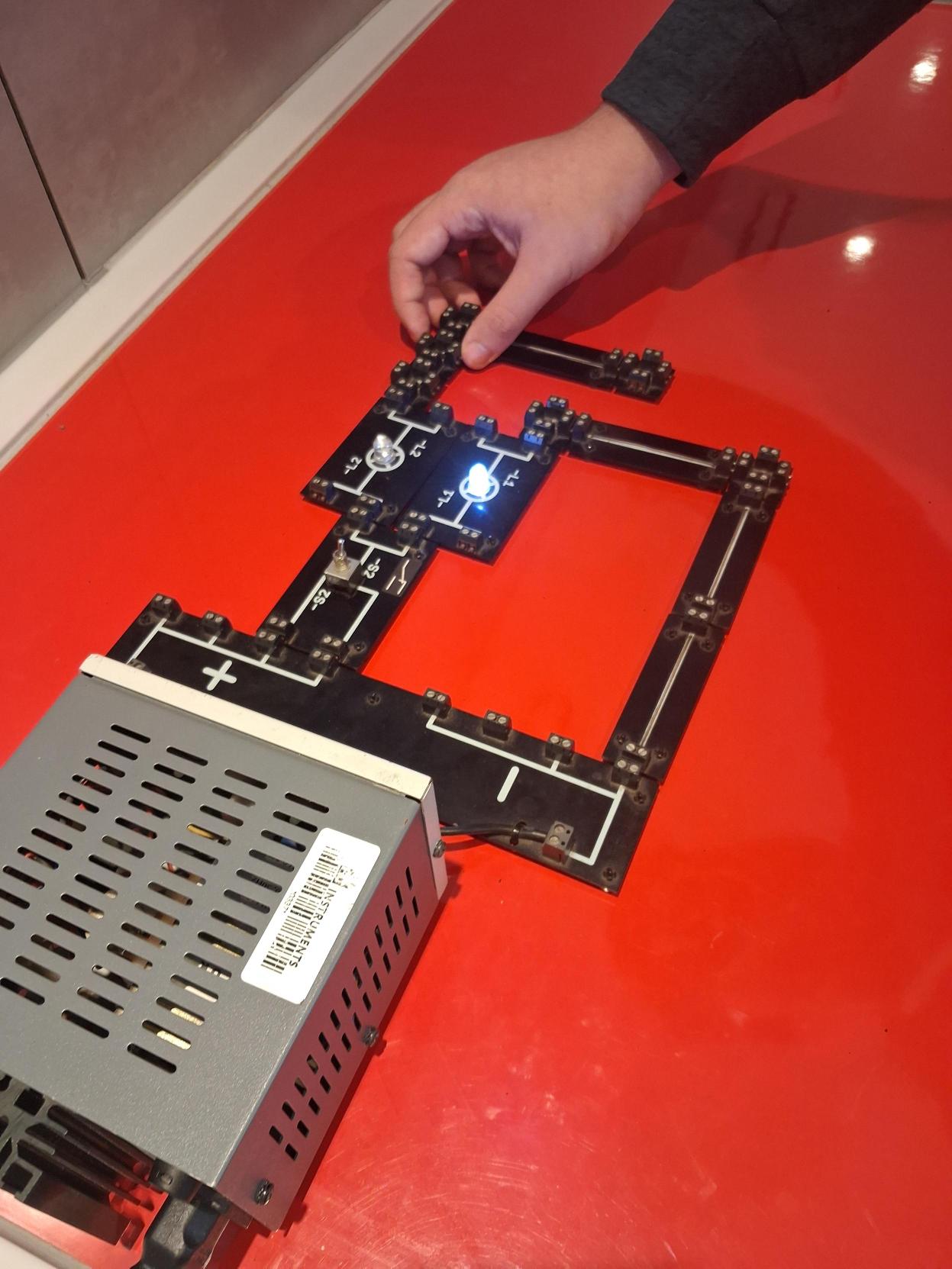 In der unteren Etage des Trucks konnten sich alle praktisch ausprobieren. Schaltkreise legen und zum Laufen bzw. Leuchten bringen, Roboterarme, die Zahnräder koordinieren, verschiedene Steckersysteme und die Pneumatik gewährten Einblicke in verschiedene Bereiche der Branche. Besonders spannend war die CNC-Fräsmaschine, mit der kleine Bilder in Metallplättchen oder Würfel gefräst werden konnten, die anschließend als kleine Andenken mitgenommen werden durften. Beeindruckend waren hier die Präzision und Vielfalt an gestalterischen Möglichkeiten.