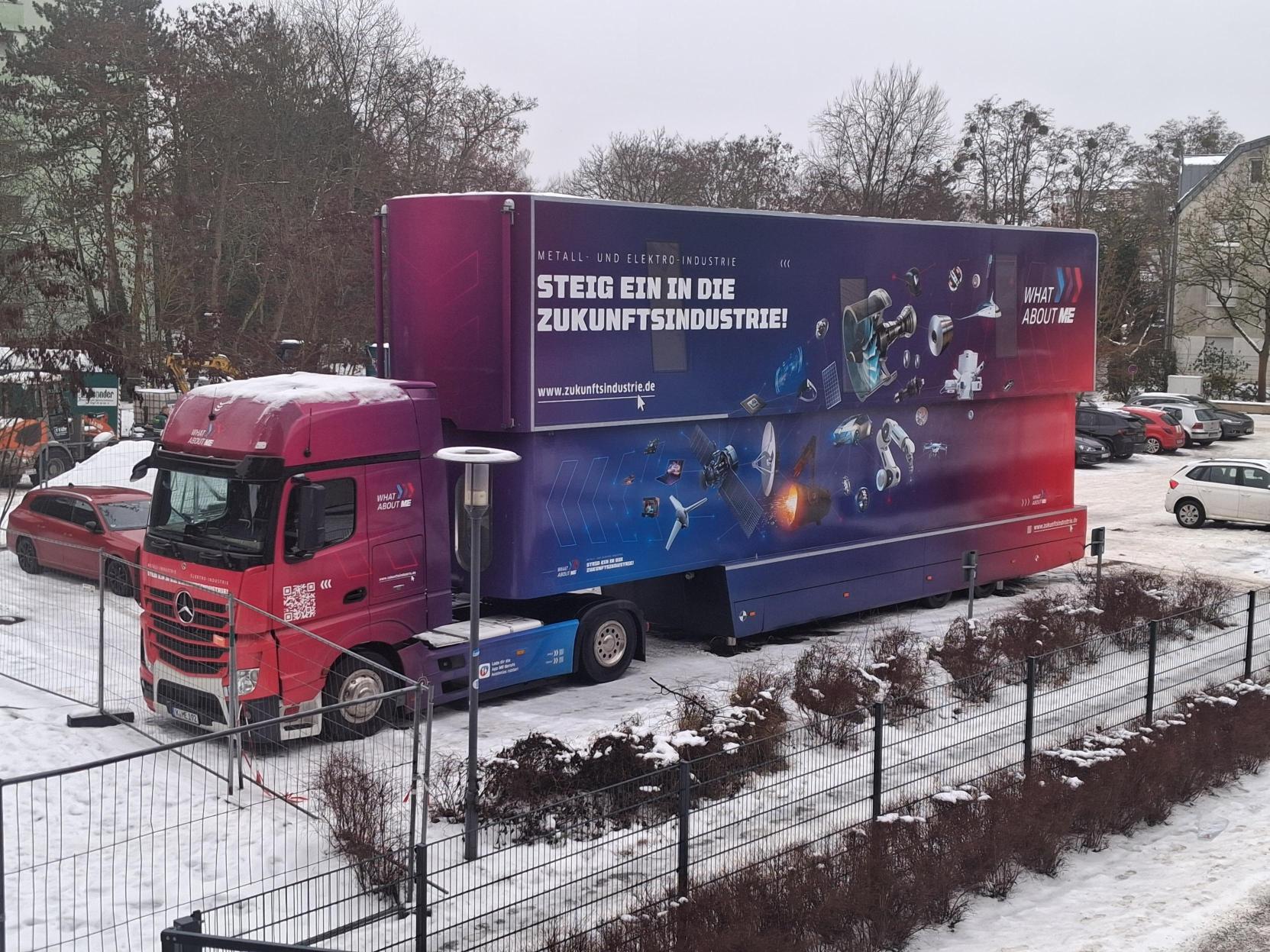 Unter dem Motto „Steig ein in die Zukunftsindustrie“ machte der Truck der Metall- und Elektroindustrie in der Woche vom 12. Januar bis 16. Januar 2026 Halt auf dem Parkplatz der HBO. Der Veranstalter war, in Absprache mit unserem Team der Berufs- und Studienorientierung, die Metall- und Elektroindustrie, die auf diesem Weg über mögliche Ausbildungsberufe in ihrer Branche informieren und mit Vorurteilen aufräumen will.