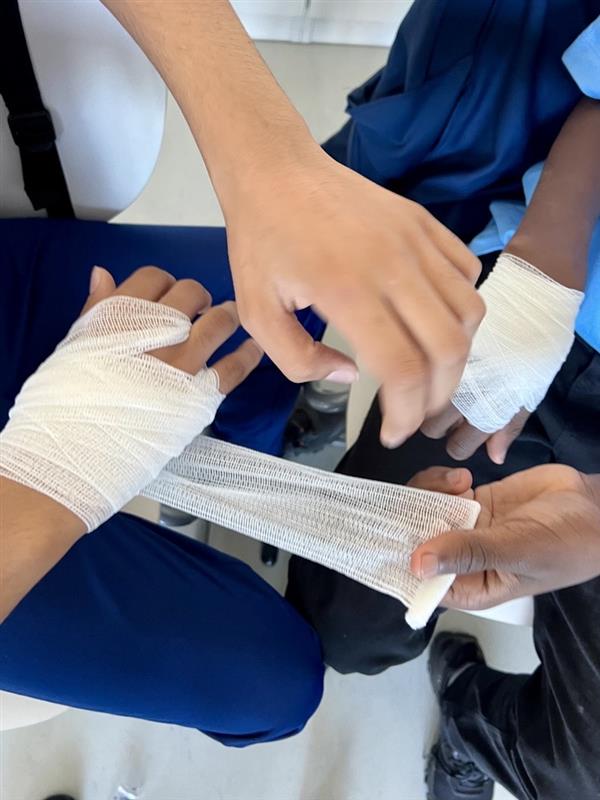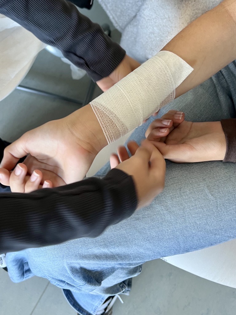 Keine Sorge: Verbände, Pflaster und Dreieckstücher wurden nur zu Übungszwecken eingesetzt. Der siebte Jahrgang in Team Weiß verbrachte den ersten Wandertag in stabiler Seitenlage und Mullbinden und erprobte Rettungsmaßnahmen von A wie Ansprechen bis Z wie Zentralpulsprüfung.