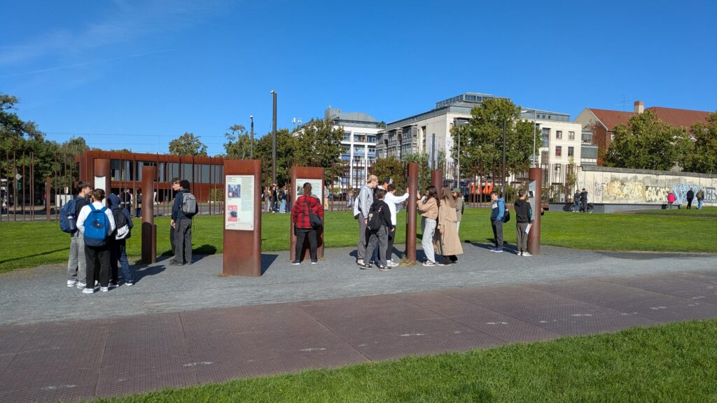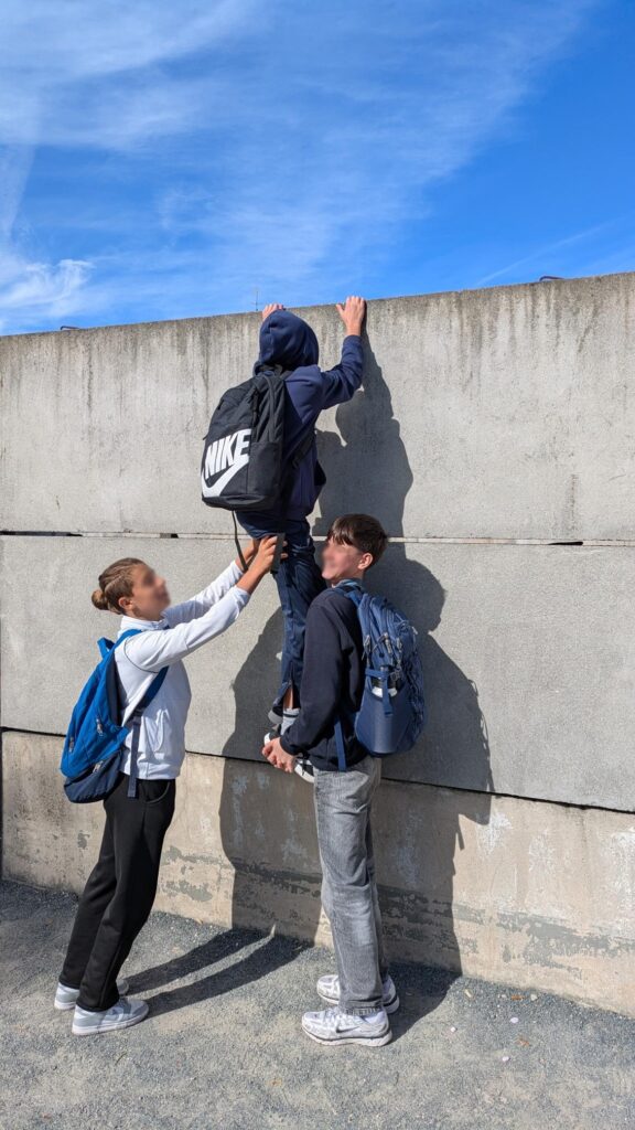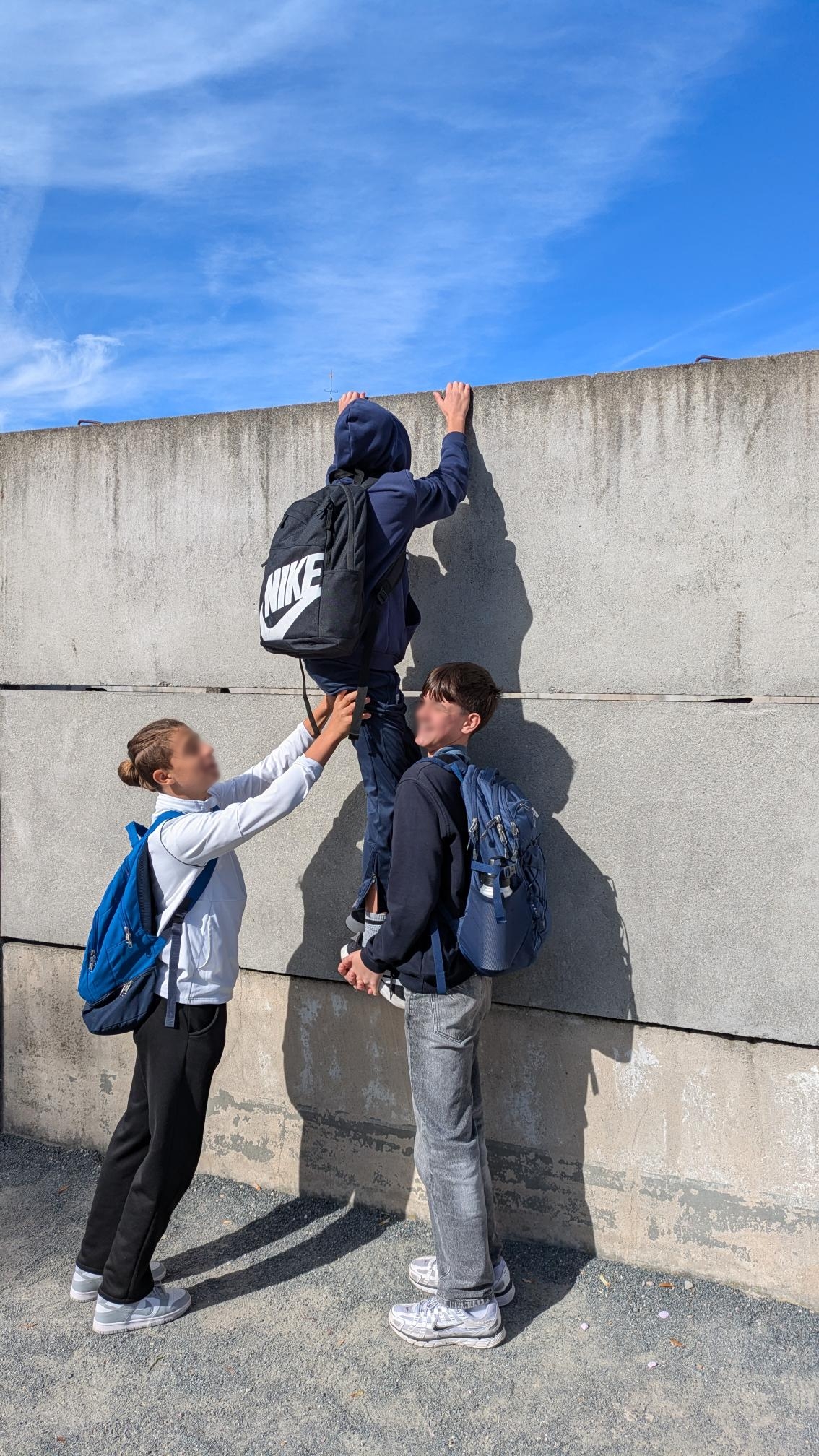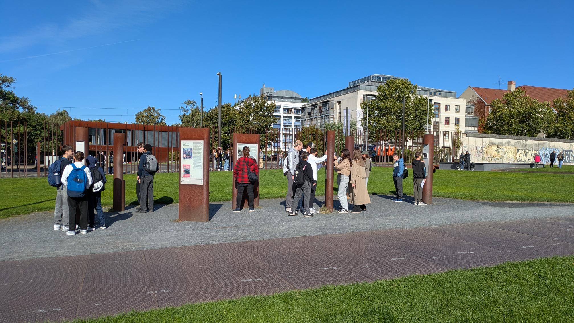 Die o4 machte sich mit ihrer Klassenleitung auf den Weg zur Gedenkstätte Berliner Mauer in die Bernauer Straße. An den Stelen konnten die Schüler und Schülerinnen wichtige Informationen zur Teilung der Stadt und der Berliner Mauer sammeln. Spannend war dabei die Diskussion zum Verlauf der Mauer und die Orientierung an den Himmelsrichtungen. Die Teilung in Ost- und Westberlin wurde vor Ort greifbar(er). Greifbar war auch die Nachstellung der „Republikflucht“, bei der das beigefügte Foto entstand.