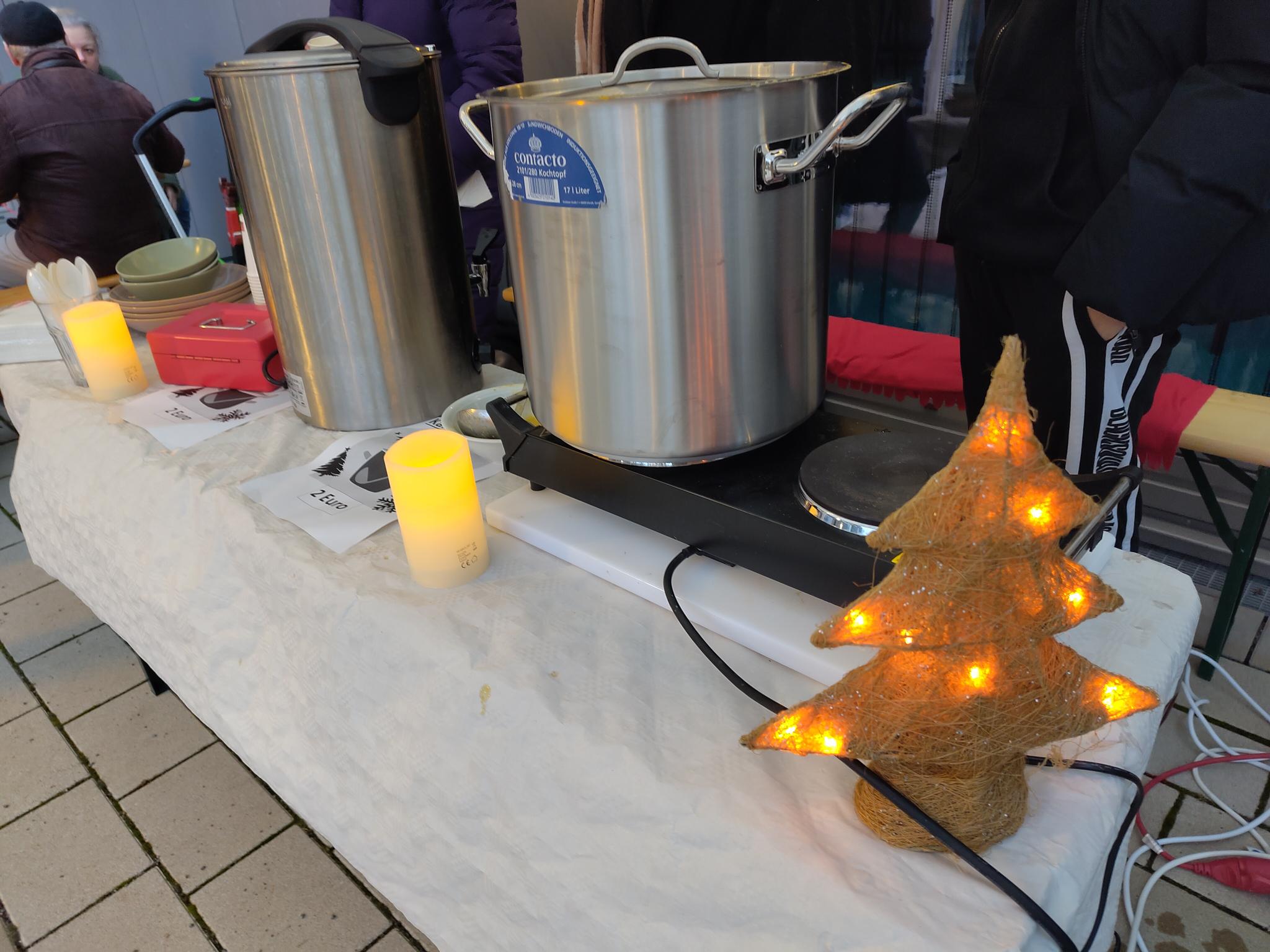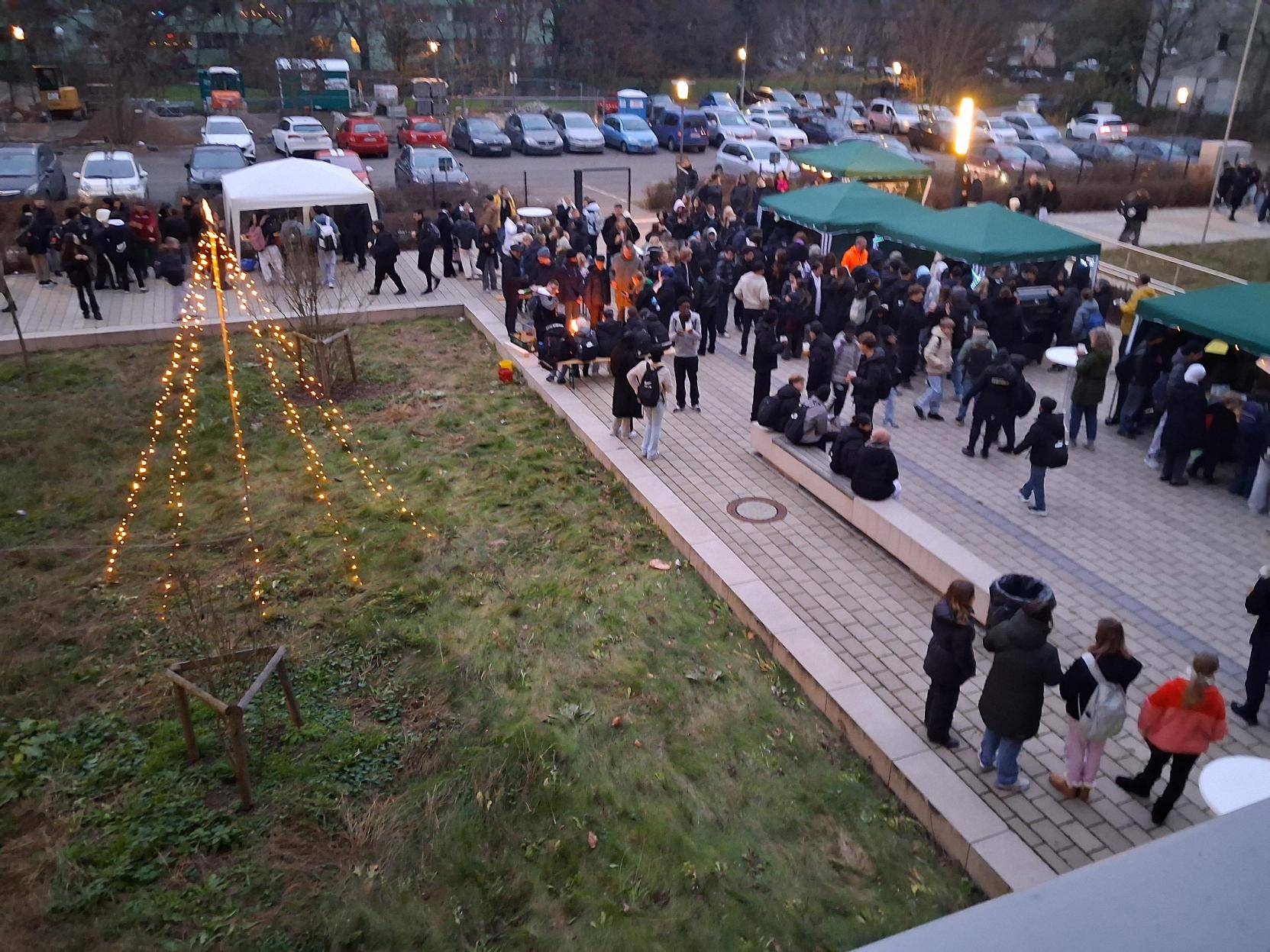 Aufwärmen konnten sich die Gäste an der Feuerschale, mit Punsch oder der selbstgekochten Kartoffelsuppe unserer Sozialpädagog*innen. Eine besonders lange Schlange bildete sich am Grillstand des Teams Orange. Auch ansonsten war mit süßem und herzhaftem Gebäck, Softdrinks und alkoholfreien Cocktails für jeden Geschmack etwas dabei.